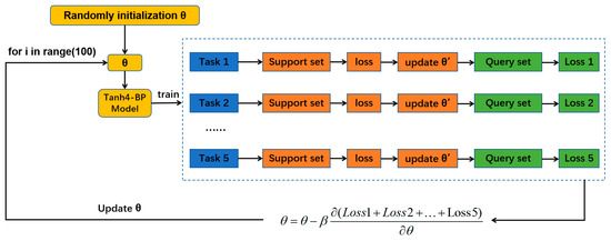 This task serves as the fundamental unit for the training of the MAML model. In this study, the training task is a three-classification problem, where 20 data samples are collected from each of the three categories, of which five are used for training and the remaining 15 are utilized for testing, forming a task also known as “3-way, 5-shot”. The query set is made up of 3 × 15 test data samples, whereas the support set is made up of 3 × 5 training data samples. In a ratio of 7:3, dataset D1 is split into the training set D1_train and the testing set D1_test. The “3-way, 5-shot” rule is used to divide the training set D1 train into task sets. The learning rate is for internal training, which updates the parameters of the training tasks, and for external training, which updates the parameters of the entire MAML model. In this experiment, is 0.1, is 0.01. Figure 11 illustrates the parameter update process for the Tanh4-BP-MAML model. The specific steps are listed below.