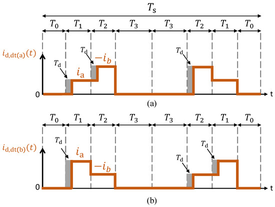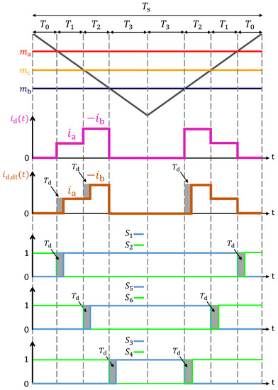 Figure 2 also shows an example of the resulting input current waveform of the three-phase VSI over a carrier period without and with the influence of dead-time (), along with the gating signals of the switches. The switching occurrence is assumed to be instantaneous (ideal switching). Therefore, the effect of switching transients caused by parasitic inductance/capacitance in the power loop is not covered here since they will unnecessarily complicate the modeling.