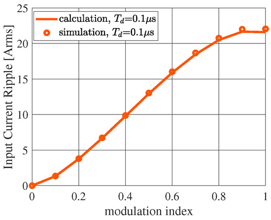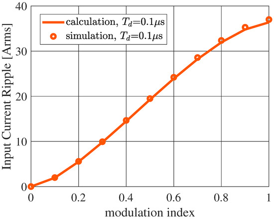 Figure 9 also shows the same trend of the decrease of rms input current ripple value with the increase of dead-time. The reduction is typically between 20% to 60% depending on the modulation index for = 2 s. The proposed equations are able to predict the simulation trends, and in this case the accuracy is not compromised for high modulation indices. This is because the phase displacement () is higher in the case 2 load, which decreases the AC output current of the three-phase VSI [26]. Therefore, the accuracy of the proposed equations holds on.