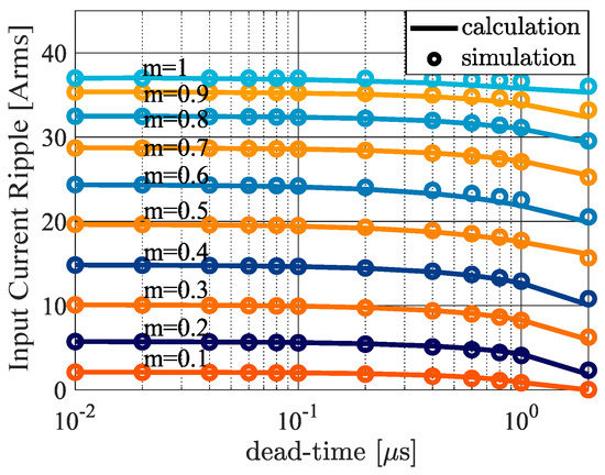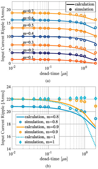 Figure 6 shows the trend of decreasing rms input current ripple with the increase of dead-time for varying modulation index. The reduction is typically between 15% to 45% depending on the modulation index for = 2 s. For 0.1 ≤ m ≤ 0.7 (Figure 6a), it is shown that the proposed equations match the simulation results closely. However, the accuracy becomes worse for high modulation indices, i.e., 0.8 ≤ m ≤ 1 (Figure 6b). This can be explained by referring to [26]. It is observed in [26] that, for high modulation index (m) and low phase displacement (), the output current ripple becomes higher. This adds up to the total rms input current ripple, which diminishes the influence of dead-time and makes the calculation results deviate from the simulation results.