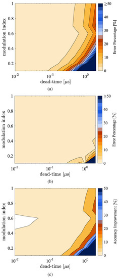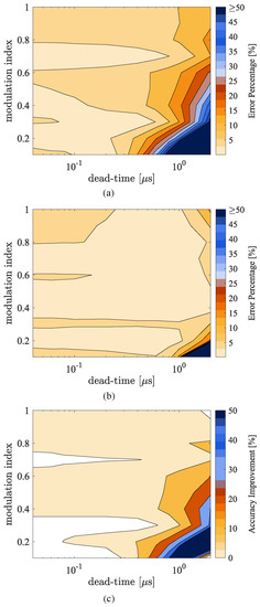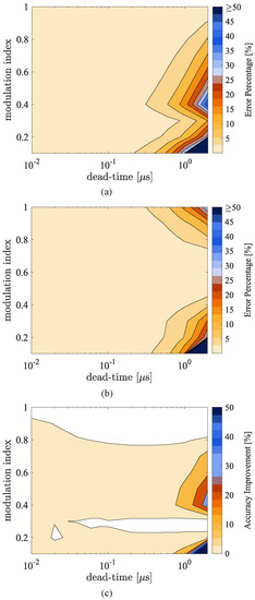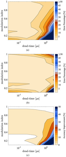From Figure 7c, it is shown that generally the proposed equations provide better accuracy than the benchmark equations. The significant improvement is shown when ≥ 0.7 s and 0.4 ≤ m ≤ 0.7. For m ≥ 0.8, the accuracy is worse due to the output current ripple influence (as explained previously). There is also a slight inaccuracy when m = 0.3 across a wide range of dead-time. However, the difference is minimum (less than 1%) and thus can be ignored.
