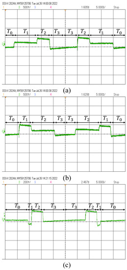 Figure 12 shows examples of the capacitor current ripple waveform produced by the three-phase VSI. It is shown that Figure 12a–c are able to reproduce the theoretical waveforms shown in Figure 3a, Figure 4b, Figure 3b, and Figure 4a, respectively. It should be noted that there is a difference in offset between the theoretical waveforms to the ones shown in Figure 12. This is due to the measurement being performed at the DC-link capacitor, which already excludes the DC component (see Equation (19)) of the input current waveform inherent in Figure 3 and Figure 4. However, the basic shape of the waveforms remains.
