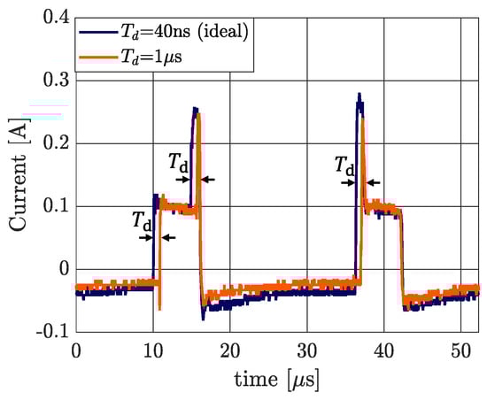 Figure 13 shows an example of the influence of the dead-time on the delay in the capacitor current waveform of the three-phase VSI. As previously indicated in Figure 2, the dead-time will only influence the rising edge of the waveform. This is also shown in Figure 13, where only the rising edges are affected. However, it should be noted that, in the experimental setup, a minimum value of dead-time still needs to be applied to avoid short circuit. Therefore, the “ideal” reference in Figure 13 (blue line) is actually using = 40 ns. Nevertheless, Figure 13 still satisfactorily shows that the dead-time only influences the rising edge of the waveform, thus confirming the initial theory.