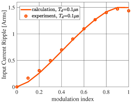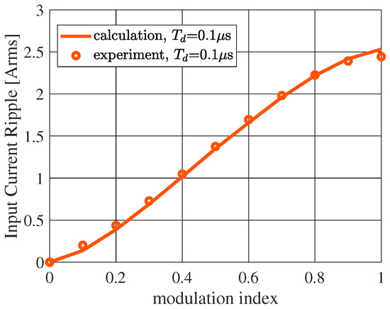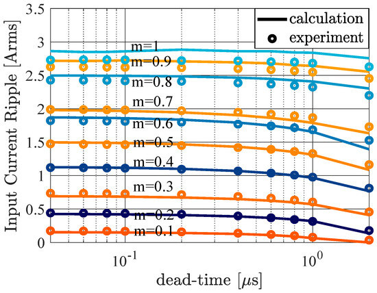 Figure 15 shows the influence of the increasing value of dead-time to the decrease in the rms input current ripple values. The decrease is typically in the range of 15% to 50% for = 2 s. Once again, the calculation results are in agreement with the experimental results up to m = 0.7. For higher modulation indices, the accuracy is worse due to the influence of the AC current ripple, as shown in the simulation results for the same load profile.