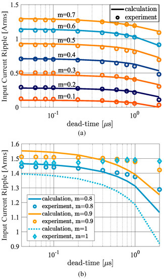 Calculation and experimental results of dead-time vs. rms input current ripple of the three-phase VSI (case 1 load) for (a) 0.1 ≤ m ≤ 0.7; (b) 0.8 ≤ m ≤ 1.