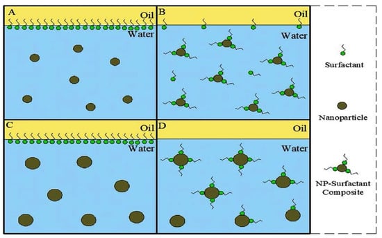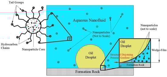 - Wettability: Hydrophobic NPs are more effective than their hydrophilic counterparts when it comes to the detachment of oil droplets from the reservoir rock. Hydrophilic NPs can lead to oil expansion and rapid detachment, which also makes the hydrophilic NPs a good candidate for EOR applications [88,89].