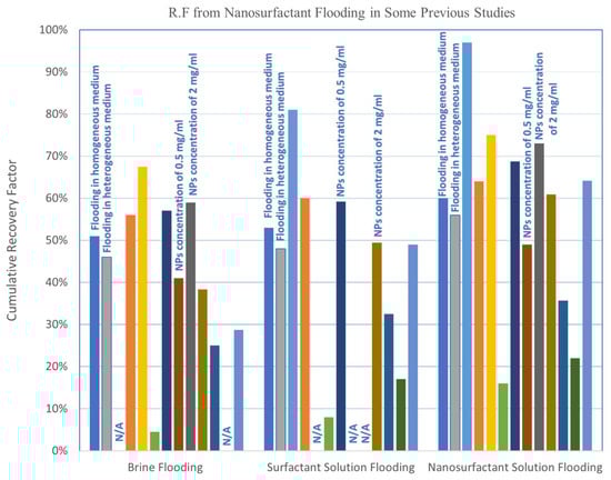 - Rock mineral type and properties: The performance of a nanofluid depends on the reservoir lithology and properties; for instance, the performance of a particular nanofluid injected in a sandstone reservoir will yield a different performance than in a carbonate one. Moreover, rock wettability influences the adsorption of nanoparticles where oil-wet reservoirs cause lower NPs adsorption than the water and neutral-wet ones [89,106].
