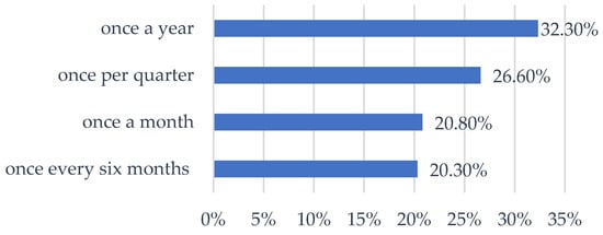 The structure of financial savings of the surveyed agricultural households was dominated by funds accumulated in savings accounts (on average 62.29%). This was followed by cash (on average 26.39% of all financial savings) and bank deposits (10.55%). Savings in the other forms account for a negligible percentage (0.77%). None of the households covered by the study had savings in the form of stocks or bonds. Then, the frequency of collecting savings by the surveyed entities was assessed, and the results obtained in this regard are presented in Figure 1.