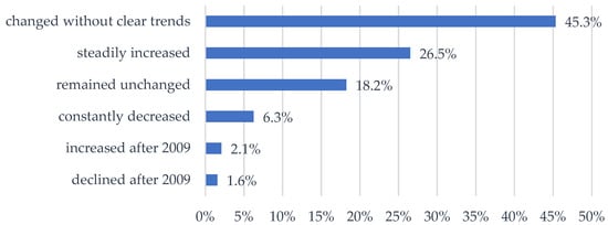 In the analyzed population, the dominant group (40.22%) involved households whose average monthly income in 2019 did not exceed PLN 1500 per person, with every fifth household having less than PLN 1000 per person. Every third household had an income exceeding PLN 2000 per person. For 27.87% of the surveyed entities, the amount of this income was between PLN 1501 and PLN 2000 per person. The amount of income of the surveyed units changed most often without clear trends (40.1%); however, in every third farm, it was constantly growing. Almost one-fifth of households did not record changes in income over the last 15 years. The main source of income of the surveyed entities was agricultural activity—75.9% of total income on average. This was followed by income from hired work, which constituted 11.14% of total household income on average. The third position was occupied by income from pensions, accounting for 3.64% of income. The shares of other sources did not exceed 3% in the total income of the analyzed agricultural households.