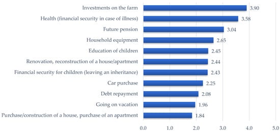 Goals for collecting savings by the surveyed agricultural households (n = 191). Note: assessment using a five-point Likert scale; 1—unimportant goal, 5—most important goal. Source: own study.