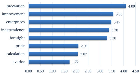 Among the surveyed farm households, the dominant motive was the desire to protect themselves against unforeseen events (precaution, M = 4.09). Half of the respondents indicated that this was the most important theme (5 on a five-point Likert scale), and another 30% indicated it as very important (4). The second most important motive for saving money was the desire to improve one’s living conditions (improvement, M = 3.56). Respondents also indicated that they save to have capital for investment (enterprises, M = 3.47), to have a sense of independence and the ability to carry out plans (independence, M = 3.38), and to meet the future needs of the household (foresight, M= 3.30). Among the least important saving goals of the surveyed households were the desire to leave an inheritance (pride, M = 2.09), obtaining additional income, e.g., in the form of interest (calculation, M = 2.07), or simply unwillingness to spend money (avarice, M = 1.72).