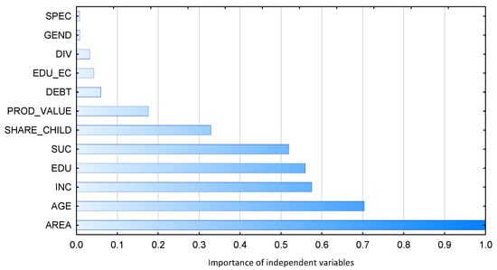 The results of the classification (savings accumulation criterion) of the surveyed agricultural households based on classification and regression trees (CRT) and the importance of independent variables included in the analysis are presented in Scheme 1 and Figure 5.