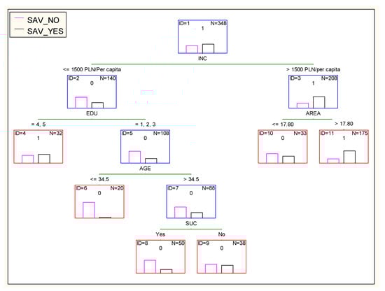The first division of the surveyed population of agricultural households was made on the basis of the INC variable. As a result of the classification, two groups were obtained: agricultural households with an average annual income per person up to PLN 1500 (ID 2) and households with an income exceeding PLN 1500 per person (ID 3). It was found that among entities characterized by a lower level of income, the majority (66.43%) did not save. On the other hand, among households with an income exceeding PLN 1500 per person, 69.2% of entities declared that they accumulate savings. The most important variable differentiating farms characterized by a higher level of income (ID 3) was the farm area (AREA). The obtained results prove that users of farms with an area exceeding 17.8 ha (ID 11) are more willing to accumulate savings than users of farms with a smaller area (ID 10); 74.29% of units from node 11 were characterized by savings, while, in node 10, less than half of the farms had this feature (42.42%). Then, the entities from node 2 (ID 2) were further divided on the basis of the education level of the head of the household (EDU). As a result of the classification, two groups were obtained: entities whose head of household had post-secondary or higher education (ID 4), more than half of which (53.13%) allocated part of their income to savings, and those whose head of household had at most secondary education (ID 5), of which 27.78% of households declared that they were saving. Next, households from node 5 (ID 5) were divided on the basis of the AGE variable. As a result of the classification taking into account the age of the head of the household, two groups were obtained: farmers aged up to 34.5 inclusive (ID 6), among whom the vast majority (95%) did not save, and farmers aged over 34.5 (ID 7), where every third respondent (32.95%) declared that their household allocates part of their income to savings. Subsequently, the entities from node 7 (ID 7) were further divided using the SUC variable. It was found that among farmers with a successor who will take over the farm in the future (ID 8), the vast majority (78%) declared that they did not save. In the second group (without a successor, ID 9), nearly half (47.37%) of the respondents indicated that they set aside part of their income for savings.