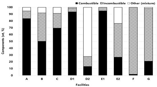 Figure 1 shows the physical composition of the residues generated at the SRF facilities. The composition ratio of residues for each facility differed depending on the type of wastes (manufacturing raw materials) as well as the characteristics of the wastes by season and region. For the physical composition of the residues generated at the SRF facilities (A to E), combustibles were in the range of 13~95%. For Facility D, and as a result of the physical composition of each residue from the specific gravity screening (D1) and soil screening (D2) processes, D1 classified more than 70% as combustibles, while D2 classified 72% of residues as others (mixed) through manual screening because most of the residues generated from the D2 process consisted of soil and fine combustibles. In the case of Facility E, the physical composition of residues by incineration (E1) classified 95% as inflammable, while landfill treatment (E2) showed a high ratio of incombustible (49%) and a large amount of other (mixed) substances that were no longer sorted. Among the residues generated at the Bio-SRF manufacturing facilities (F and G), 77~98% were non-combustible materials, such as nails and hinges.