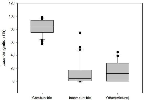 Proximate analysis (three components and LOI) was conducted on each physical composition (i.e., combustibles, incombustibles, and others) of the residues. The moisture content of the residues from the SRF manufacturing facilities was in the range of 3.2–50.4%, with an average of 16.6%. The high moisture content is associated with seasonal influence at the time of sampling (wet samples in the rainy season were stored); however, the average moisture content of the residues appeared similar. As shown in Figure 2, the LOI of residues from the SRF facilities was, on average, 81.3% (57.6–98.5%), of which inflammables and others (mixed) were 15.4% (0~74.7%) and 15.4% (0~44.8%), respectively. Among the residues of the Bio-SRF manufacturing facilities, the average LOI of the combustibles was 94.9%. The ash content of the combustibles, according to the physical composition of the residues, was an average of 18.7% (1.5~42.4%) for combustibles from SRF manufacturing facilities and 5.1% (3.9~6.1%) for those from Bio-SRF manufacturing facilities. The proportion of samples that satisfy the quality standard of ash content (20% or less) was about 66.7% in the case of the SRF manufacturing of combustibles, and in the case of Bio-SRF, the proportion of samples that satisfy the quality standard of ash content (15% or less) was 100%.