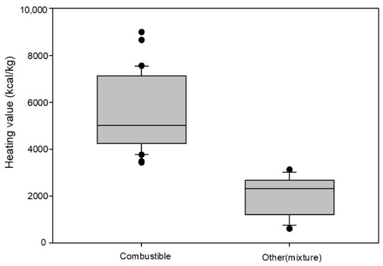 Figure 3 shows the results of the heating value analysis for the combustibles and others (mixed) according to the physical composition of the residues from the SRF facilities. In the case of the others (mixed) samples, those not sorted by their physical composition were excluded. The dry-basis Higher Heating Value was measured using a bomb calorimeter, which showed an average value of 5555 kcal/kg (3432–8992 kcal/kg) for the combustibles and 2039 kcal/kg (615–3127 kcal/kg) for the others (mixed). In the case of manufacturing combustibles of residues with SRF, the Lower Heating Value (LHV) was calculated through moisture and hydrogen content corrections in order to compare with the quality standard for the LHV. The results showed that approximately 89% of the sorted combustibles had an average heating value of 3500 kcal/kg or higher.