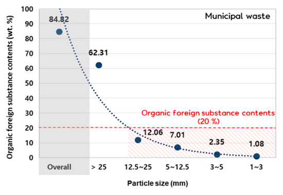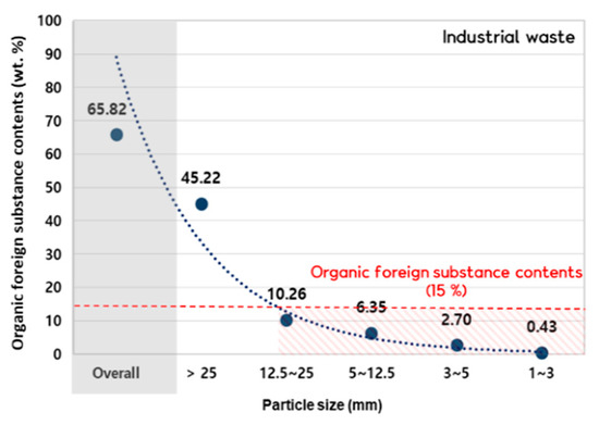 The organic foreign substance contents by the particle size of the residues were analyzed according to the method of testing the organic foreign substance contents of the recycled aggregate (KS F 2576), as shown in Figure 4. The screening effect was assessed with an assumption that the organic foreign substance contents, except for the separated inorganic foreign substances, comprise the whole contents of the organic foreign substance contents. The results showed that the organic foreign substance contents at a particle size of 12.5~25 mm or less were 12.06% for the residues of municipal wastes and 10.26% for those of industrial wastes. As the organic foreign substance contents by particle size decreased after screening and finer incombustibles such as glass fragments were contained in the separated residues of smaller particle sizes, it was difficult to proceed through manual screening for wastes of 3 mm or less. Therefore, for a post-processing management plan for the residues generated in SRF manufacturing facilities, it would be appropriate to manage the wastes brought in with an appropriate particle size of 25 mm or less by applying organic foreign substance contents of 20% or less for the municipal wastes, and about 15% or less for industrial wastes.