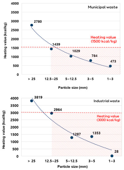 The heating value by the particle size of the residues was analyzed according to the ‘test analyses for the quality control of solid fuels’, as shown in Figure 5. In general, the smaller the particle size, the lower the heating value. The residues from SRF manufacturing had a high heating value; 3819 kcal/kg at a particle size of 25 mm or more at Facility A, which uses industrial wastes as raw materials, and 2780 kcal/kg at Facility B, which uses municipal wastes as raw materials. Therefore, for a post-processing management plan for the residues generated in SRF manufacturing facilities, it would be appropriate to manage the wastes brought in with an appropriate particle size of 25 mm or less by applying a heating value of about 1500 kcal/kg or less for municipal wastes and about 3000 kcal/kg or less for industrial wastes. For the efficient use and treatment of residues, incineration treatment could be considered for those at a particle size of 25 mm or more and landfill treatment for those at a particle size of less than 25 mm.
