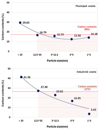 The carbon content by the particle size of the residues was analyzed according to the ‘test analyses for the quality control of solid refuse fuel’, as shown in Figure 6. The results showed that, for those with a particle size of 25 mm or more, Facility A showed a carbon content of 41.36%, and Facility B showed a carbon content of 29.63%. The residues at Facility A were generated through a screening process for a particle size of 50 mm, showing a high proportion of combustible materials, such as vinyl and plastic. Therefore, an additional post-treatment process for appropriate particle size is required. The analysis for Facility A also showed that the range of change in carbon content was larger as the particle size decreased, while the carbon content at Facility B remained in the range of 12.56–16.79% at a particle size of 25 mm or less. Therefore, for a post-processing management plan for the residues generated in SRF manufacturing facilities, it would be appropriate to manage the wastes brought in with an appropriate particle size of 25 mm or less by applying a carbon content of less than approximately 18% for municipal wastes and approximately 27% or less for industrial wastes.