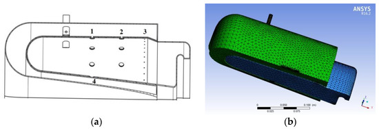 The same biofuels were used in paper [35] but with reference to an annular reverse flow combustor of a 30 kW MGT [26]. The combustor geometry was realized with a CAD (Figure 2a) while the mesh (Figure 2b) and CFD simulations were realized with ANSYS software.