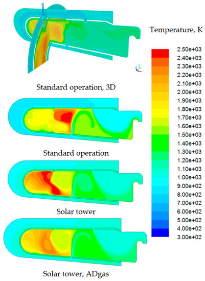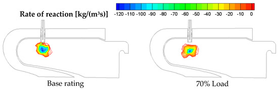 Based on this experience, the following work of the author [36] used the same strategy of split injection to overcome the limits of hydrogen percentage in the mixture, that was found to be 10% in volume. However, the analysis was conducted on the same burner using only the Finite Rate—Eddy Dissipation and the EDC approaches for the same kinetic mechanisms. Most importantly, the study also involved the operation of MGT under unconventional conditions in terms of load level and fuel supply. The assessment of part load conditions was necessary because, in the real MGT operation, the pilot line is activated only if the load is below 70%. The results in Figure 5 outline different combustion behaviours; indeed, when the fuel was injected from the premixed line the ignition began near the injector. Hence, the splitting of fuel could not only avoid the risk of flashback but could also not be affected by high temperatures thanks to this configuration in which the high reactive zone was located farther from the injector.