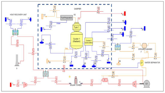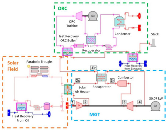 Cameretti [88] analysed a hybrid layout in which a solar tower was integrated with a MGT fed by a gasifier which produced syngas from olive pits (Figure 7). The tower solar field provided partial or total replacement of fuel heating to the MGT depending on the month of the year and the hour of the day. For this reason, a parametric study was necessary to assess the behaviour of the system and especially the gasifier, when the working point changed due to the different syngas LHV and, therefore, the fuel flow rate. Results indicated that the power plant was able to satisfy the power demand exploiting exclusively renewable resources but at the expense of the overall efficiency affected by the losses in the gasification process.