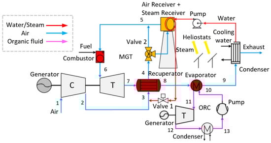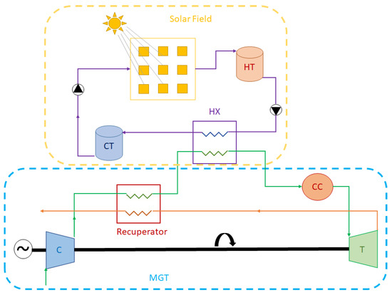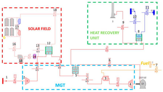 Generic layout of a hybrid MGT-solar power plant.