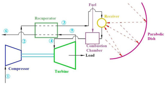 Generally, as displayed in Figure 8, a hybrid solar-MGT system consists of two parts: the solar field and the thermal conversion unit. The former, besides reflectors/concentrators and a receiver can be provided with thermal storage, and a hot and a cold tank capable of maintaining temperature levels in a fixed range. The latter is the micro gas turbine with the compressor, the combustion chamber, and a recuperator to compensate the efficiency decay consequent to the reduced scale typical of this kind of plant.