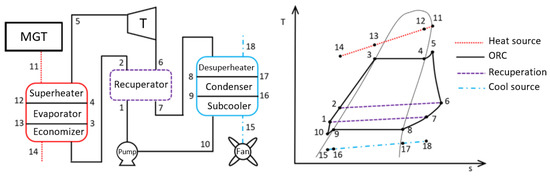 - Yoon, S.; Kim, M.; Kim, I.; Kim, T. Comparison of micro gas turbine heat recovery systems using ORC and trans-critical CO2 cycle focusing on off-design performance. Energy Procedia 2017, 129, 987–994. [Google Scholar] [CrossRef]