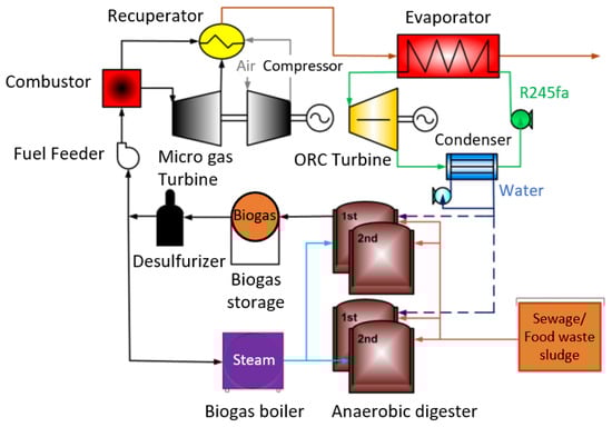 - Kim, S.; Sung, T.; Kim, K.C. Thermodynamic Performance Analysis of a Biogas-Fuelled Micro-Gas Turbine with a Bottoming Organic Rankine Cycle for Sewage Sludge and Food Waste Treatment Plants. Energies 2017, 10, 275. [Google Scholar] [CrossRef]