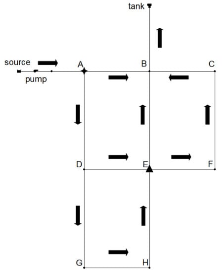 Figure 1 shows a simplified WDN model, consisting of one reservoir, one pool, eight nodes, and 12 pipelines. The black arrow represents the water flow direction. The asterisk represents the contamination is injected from point A. The triangle represents that a water quality sensor is placed at point E. Under the influence of water flow, pollutants will spread to other locations in the WDN and be detected by the water quality sensor. It can be seen from Figure 1 that the polluted water mainly flows in three directions: from point A to point B to the pool, from point A to point D to point G, and from point A to point D to point E. When the water quality sensor at point E detects that the pollutant concentration exceeds the threshold value, the sensor will set off an alarm, indicating that a pollution event has been detected.
