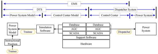 The structure of DTS and its relationship with the practical dispatching system is shown in Figure 1 [28]. In the practical dispatching system, dispatchers operate the real power system through the control center, which includes the automatic generation control (AGC) module, the supervisory control and data acquisition (SCADA) module, and the database. DTS, as a simulation of the practical dispatching system, consists of a power system model and a control center model. To ensure the effectiveness of training, the power system model of DTS should simulate the practical power system as realistic as possible, and the control center model of DTS is a copy of the practical control center, both of which are operated in the same supporting software and hardware as the practical dispatching system. DTS, together with the control center, forms the energy management system (EMS), monitoring and managing the power grid in real-time.