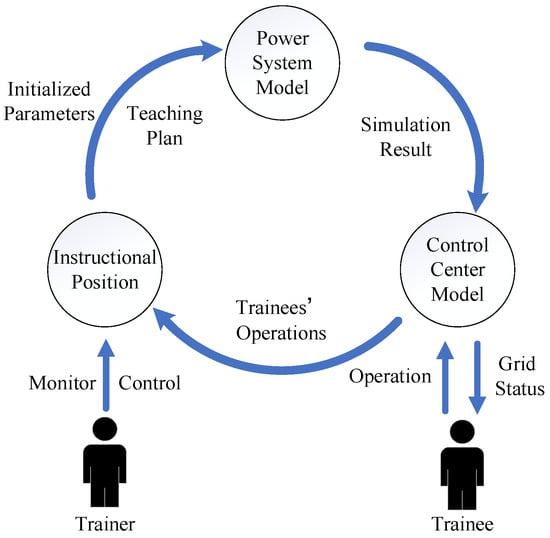 As shown in Figure 2, when the system starts, the instructional position first passes the pre-defined model, data, initial power flow, schedule, and other parameters to the power system model. Then the power system model starts the simulation and sends the results to the control center model. The control center model displays the current grid status to the trainee, who then operates accordingly. The operation will be sent back to the instructional position and then to the power system model to change the grid status. The trainer can monitor and control the training process through the instructional position.