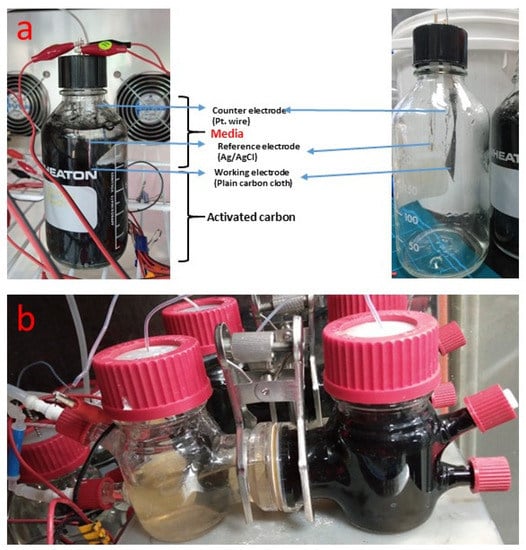 Nevertheless, low power generation is one of the main challenges for the application of microbial fuel cells (MFCs) in real-time. MFCs are a type of bioelectrochemical cells which uses biocatalysts, such as bacteria, for catalyzing the reaction. Ohmic losses, sluggish kinetics, and the development of a concentration gradient between the electrodes are the major reasons for the low performance of the MFCs [,]. Several attempts have been made to improve the performance of the MFCs by modifying the reactor configurations, using different electrode materials, applying transient operations, and adjusting the pH [,]. In recent years, the application of low-cost carbon-derived biomass, such as activated carbon powder (ACP), granular activated carbon (GAC), and activated carbon nanofibers (ACNs) has attracted a lot of attention due to their excellent electrochemical stability [,,]. Among them, GAC is one of the most promising, readily available, and inexpensive materials, which can store electrons in the form of an electrical double layer (EDL), and a continuous current can be generated with intermittent contact between the GAC particles and the current collector [,].