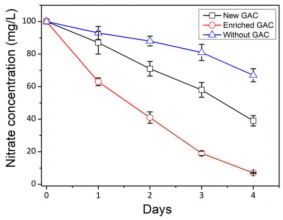 Figure 2 shows the removal of NO3−-N in the MFC under different cathode conditions. The GAC-biocathode showed a significant amount of NO3−-N reduction at the same time compared to GAC and without the GAC cathode systems. Faster denitrification with the GAC-biocathode was due to the bacteria enriched on the GAC surface which resulted in a maximum reduction of NO3−-N on the first day (close to 40%), thereafter the rate dropped slightly due to the availability of stored charge in the GAC. GAC without the enriched bacteria showed the next best results with an approximately 50% NO3−-N reduction, observed over three days. However, the effect of GAC was noticeably higher irrespective of enrichment compared to the MFC without GAC. Throughout the four-day run experiment in the MFC, more than 90% denitrification was observed with the GAC-biocathode. The effect of denitrification was also observed with the potential generation in the MFC, where the electric potential ceased concerning NO3−-N availability in the cathode chamber.