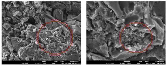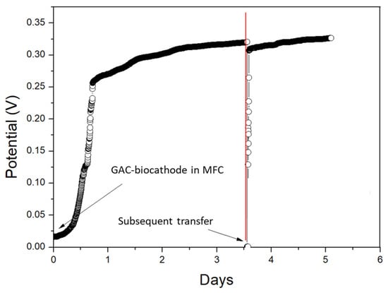 The micrographs from scanning electron microscopy are shown in Figure 8. A group of bacteria appearing to be similar in morphology (slender rods with 0.5 µm) were found adhered to the surface of the GAC. These bacteria were seen to have adhered to the surface of the GAC and had direct communication with it rather than forming a biofilm, which is a commonly observed phenomenon in electroactive bacteria. In general, GAC has a large porosity and adsorptive capacity that can spread clumped microbes adsorbed onto the electrode surface and increase the surface area of the electrode []. Consequently, the higher specific area enabled the more effective collection of electrochemically active microorganisms and the performance of GAC increased accordingly. The GAC acted as a porous material with a variety of internal large holes and mesoporous structures. The rough surface of the GAC facilitated the attachment and growth of these bacteria and possibly directed electron sharing. The attachment and enrichment of bacteria as well as the colonization of the surface had a direct impact on the voltage output of the MFC.