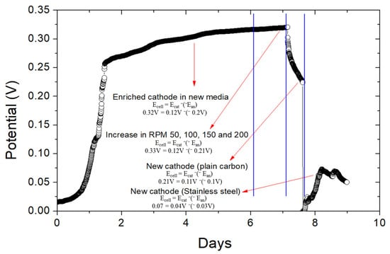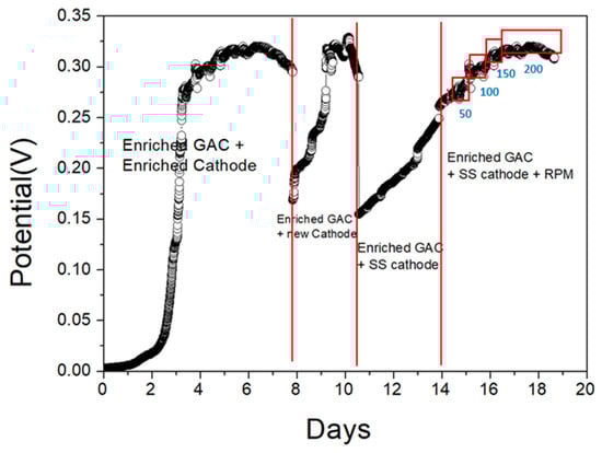 The cathode remained in batch operation during all experiments. The cathode chamber was supplied with a 100 mg/L nitrate-N whenever there was a decrease in potential, corresponding to a depletion of NO3−-N in the media. 2 g of enriched GAC was added in the cathode chamber and operated at different RPM using a magnetic stirrer (2.5 cm). A fixed external resistance of 1000 Ω was plunged between the anode and cathode electrodes. The potential generated was measured every 10 min using a digital precision data acquisition system (Model 2700 Keithley Instruments, Inc., Beaverton, OR, USA) integrated into a personal computer.