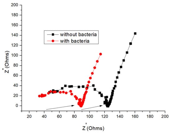 The electrochemical properties of the cathode were investigated by CV and EIS. The EIS test performed in the presence and absence of GAC-biocathode enrichment showed that the internal resistance and charge transfer of the MFC decreased with the GAC-biocathode compared to one without (Figure 6). These results strongly suggest that the electrochemical performance of the MFC in power generation can be improved with the application of a biocathode and can minimize the losses associated with the system. The use of GAC helps to decrease the internal resistance of the MFC thereby improving charge/electrons recovery.