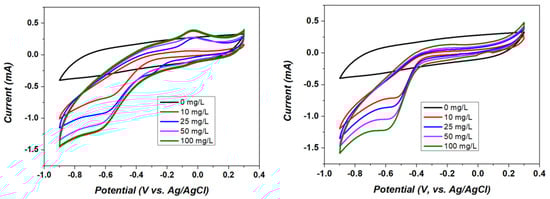 Figure 7 shows the CV graphs plotted at different concentrations of NO3−-N and NO2−-N. The CV analysis was performed to assess the redox activity of the biocathode in the MFC for reduction reactions. NO3−-N and NO2−-N were used as reducing species for this purpose due to their similar properties to become reduced by a similar bacteria during denitrification reactions when occurring in wastewater, anaerobic sludge, and other environmental conditions. A small hump during the forward scan was observed with NO3−-N indicating there was an oxidation reaction at high concentrations (100 mg/L NO3−-N concentration) which was inconsistent with low concentrations under the same conditions. However, the reduction peaks showed consistency in all reverse scans in CV indicating the effectiveness of the GAC-biocathode in reduction reactions. Similar observations were also noted when operated with NO2−-N. The reduction peaks observed with NO2−-N were more consistent with all tested concentrations. There was no observance of the peak current at 0 mg/L of NO2−-N and NO3−-N in the MFC.