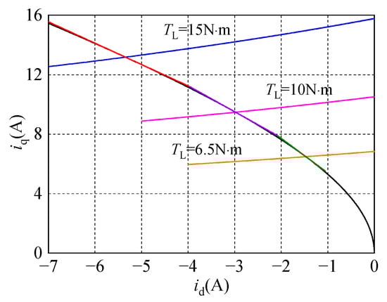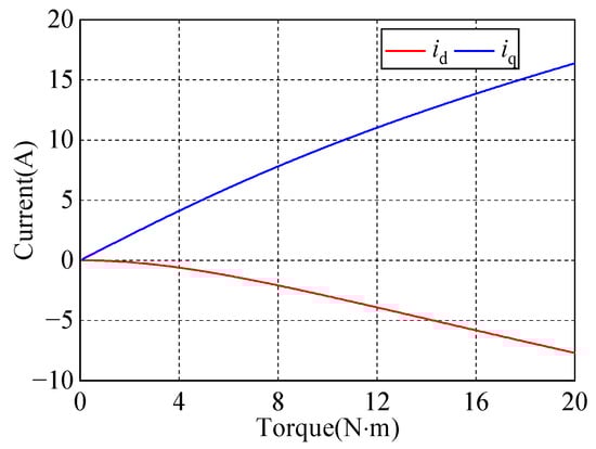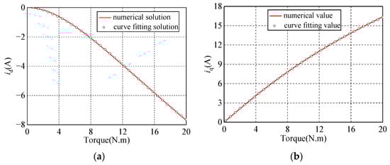 Equation (8) is a complex quartic equation about iq, whose solution can be obtained by the numerical method. It should be noticed that the value of iq is positive, whereas id is negative for the condition that Ld < Lq. The nonlinear curves of id and iq varying with Te are given in Figure 1.