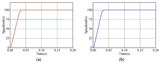 During the simulation process, the load torque is set to 5 N·m and the speed reference is 100 rad/s. Figure 5 exhibits the speed response of the IPMSM with two control methods. It can be observed from Figure 5a that the machine can reach the reference speed within a very short period, indicating that the system has excellent dynamic and static performances with strategy 1. Control strategy 2 has similar response speed during the start−up process. However, the phase current would exceed its limited value for this condition. Figure 6 shows the d-axis and q-axis components of the armature current with control strategy 1 and strategy 2. It can be seen that the d-axis current under strategy 2 maintains to zero. By comparison, the d-axis current is not zero but a negative value when strategy 1 is employed.