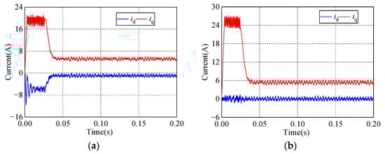 The d-axis and q-axis current with (a) control strategy 1; (b) control strategy 2.