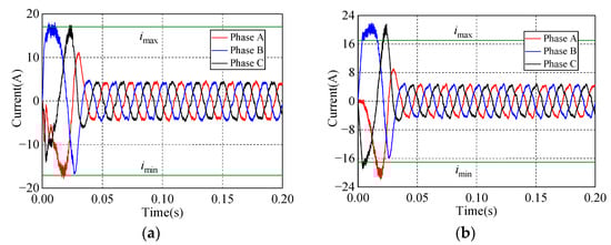 The three phase currents with control strategy 1 and strategy 2 are compared in Figure 7. As stated in [26], strategy 2 is an unconstrained controller, and the speed response of this control strategy is related to the gradient of the speed trajectory. When the speed trajectory is changing quickly, the armature current would exceed its limit value during the dynamic process, which is reflected clearly in Figure 7b. So, the speed trajectory must be chosen to keep the armature current within its threshold, and the integral gain needs to be adjusted simultaneously. However, the change of integral gain would affect the machine performance. In addition, it is difficult to obtain the appropriate value of these parameters. By comparison, the strategy 1 proposed in this paper solves this problem by adding the voltage and current constraints.