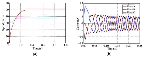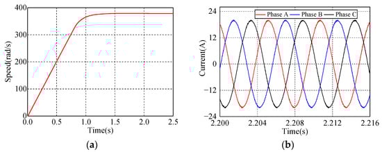The load torque is set to rated load and the speed reference is rated speed. Figure 13a exhibits the speed response of the IPMSM with the proposed control strategy, and Figure 13b gives the phase current when the machine operates with rated speed and full load. As can be seen in Figure 13, the machine can operate with full load at rated speed. Furthermore, it can be observed from Figure 13a that the machine can reach the rated speed within 1.5 s. The response time is short. Moreover, the machine can reach the rated speed without overshoot, which indicates that the machine has excellent dynamic performances with the proposed control strategy.