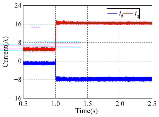 For further verification, the load torque of the machine is set to 5 N·m originally, but stepped up to 20 N·m at 1 s. Figure 9 gives the speed response and the phase current curves of the machine, respectively. It can be seen that it takes about 1 s for the steady−state error to maintain to zero as the load torque is increased suddenly up to 400%. Figure 10 shows the d-axis and q-axis components of the current corresponding to the proposed controller. In the steady state, as clearly shown in Figure 10, the d-axis current maintains to about −8A, whereas the q-axis current turns into 16A, approximately. In addition, the two components of the armature current id and iq satisfy the linear constraint given in Equation (9). Figure 11 compares the A phase armature current when the machine operates with the reference speed. The machine is controlled by two different control strategies. On the premise of obtaining the same electromagnetic torque, it is obvious that the steady−state armature current under strategy 1 is smaller than that of strategy 2. It indicates that the proposed controller has a higher torque−to−current ratio than the other control strategy.