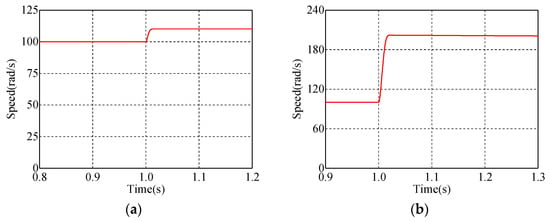 Then, the speed response of the machine for step speed change and rapid speed change conditions are researched. The reference speed is set to 100 rad/s originally, but stepped up to 110 rad/s and 200 rad/s at 1 s, respectively. Figure 12 gives the speed response of the machine. As shown in Figure 12a, the machine can reach the reference speed within 0.02 s without overshoot. For the rapid speed change condition, the machine speed would approach the reference speed rapidly with a little overshoot. Then, the static speed error is eliminated within 0.1 s. Simulation results indicate that the machine has excellent dynamic performances for speed change condition.