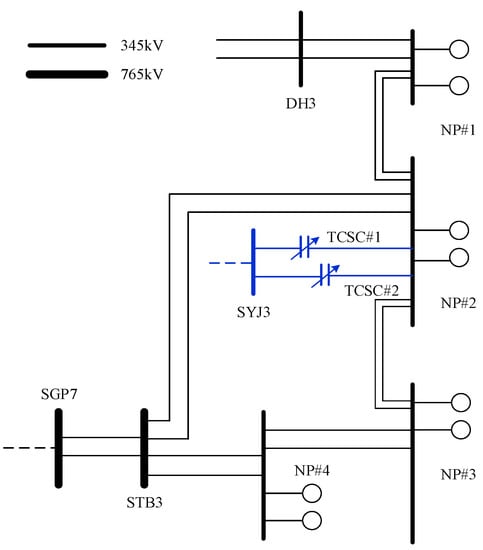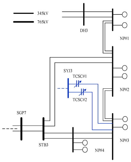 In addition, in preparation for the simultaneous failure of two nearby 765 kV transmission lines, 50% of the transmission line reactance is compensated in the normal state, with a maximum of 70% compensation for 10 s in case of failure, which significantly improves system stability and reduces restriction costs. Figure 3 shows the composition of the TCSC installed at the SJC and SYJ substations, and the roles of each part are as follows.