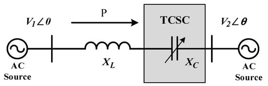The TCSC consists of a capacitor connected in parallel with a thyristor-controlled reactor (TCR), a metal oxide varistor (MOV) for protection, and a bypass breaker. The TCSC increases the transmission capacity by controlling the transmission line impedance. Equation (1) is a general power transfer calculation formula of an alternating current system, and the amount of power transfer is determined by the transmitter voltage , receiver voltage , phase difference , and transmission line reactance [17,18]. Figure 2 shows the transmission line impedance compensation and transmission capacity increase according to TCSC.