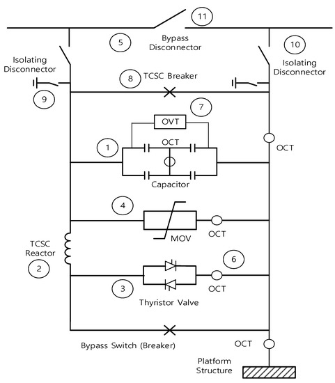 - TCSC Breaker (8), Isolating DS (Disconnect Switch) (9,10), Bypass DS (11)