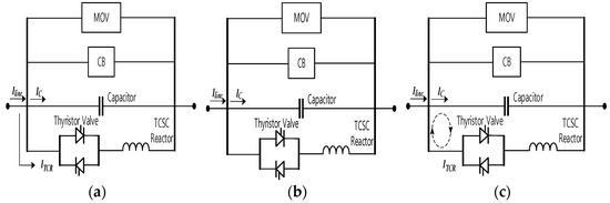 TCSC control mode. (a) Bypassed-thyristor mode. (b) Blocked-thyristor mode. (c) Capacitor vernier mode.